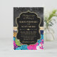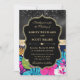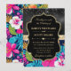 Invite guests in dazzling style with this wedding invitation featuring a black ornate frame trimmed in gold, set against a sparkling silver-accented background. The vibrant tropical floral border in pink, blue, yellow, and green adds joyful energy and exotic charm—perfect for destination weddings, garden ceremonies, or any event that blends bold color with elegant sparkle.