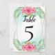 Tischnummer Karten, Schöne tropische Hibiskus Blume mit rosa Blumen, grüne Blätter und türkisblaue Aquarellakzente und goldene Rahmen Detail. Feiern Sie ein Strandthema mit hellen und sanften tropischen Ozeanfarben, perfekt für eine Hochzeit in Urlaubsort, eine Inselrundfahrt oder einen hawaiianischen Ausflug.