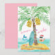 Die Weihnachtskarte zum Thema "warme Wünsche" bietet eine tropische Insel, Surfbrett und Muscheln mit einer Palme, die in Strandleuchten verziert ist. Der Weihnachtsmann macht eine Pause vom Surfen und spielt im Ozean, trinkt von einer Ananas und wirft den Hawaiianischen Aloha auf lockeres Shaka-Schild mit einer Meerjungfrau, die seine Richtung schwimmt. Kunstwerk von KL Stock.