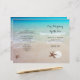 Tropical beach mariage plié programme de cérémonie. Eau océanique turquoise et sable de plage lisse est l'arrière - plan de ce programme personnalisé qui sera plié en deux. La police décontractée en gris foncé est facile à customiser sur quatre "pages". Dollars de sable et étoiles de mer décorent pour représenter le couple.