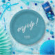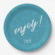 Farbenfrohe Papiertafelgestaltung mit einem nahtlosen Muster aus Palmblättern in aquamarinen Farbtönen mit fett-weißem "Enjoy text". Fügen Sie Ihre Initialen und das Hochzeitsdatum mit der bereitgestellten Vorlage hinzu. Dieses tropische Design ist ideal für Sommer-, Strand- und tropische Hochzeiten, Geburtstage und andere besondere Veranstaltungen. Suchen Sie die ID577, um passende Produkte anzuzeigen.