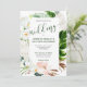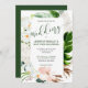 Tropische Blume in Aquarelltönen, die aus Orchideen und Magnolien in Weiß- und Rosatönen mit dunklem Grün bestehen. Das Wort "Hochzeit" fegt in einem verzierten kalligraphischen Schriftart über die Kartenvorderseite.