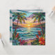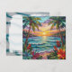 Pretty blank notecard with a gorgeous ai impasto oil painting style illustration of the blue ocean, a sandy beach surrounded by palm trees at sunset. Inside is a cute crab and sea glass.
