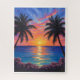 Escape into a world of color and calm with this vibrant puzzle featuring a stunning tropical sunset. Warm golden light reflects across the ocean as palm trees frame a dramatic sky filled with shades of pink, orange, and blue.
