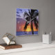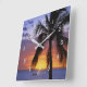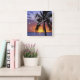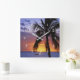Tropischer Sonnenuntergang mit Palmen im Vordergrund, quadratische Wanduhr.