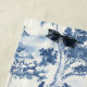 Das Bild zeigt ein klassisches toile de Jouy-Muster, das sich durch detaillierte blaue Szenen auf weißem Hintergrund auszeichnet. Es bietet tropische Landschaften mit üppigen Palmen, felsigem Gelände und ruhigen Gewässern. Es gibt Elemente wie kleine Hütten, Fliegenvögel und weit entfernte Inseln, die dem Design ein idyllisches, friedliches Gefühl geben. Das Muster ist komplex und vermittelt ein Gefühl traditioneller, pastoraler Eleganz, das oft mit französischen dekorativen Künsten in Verbindung gebracht wird.