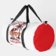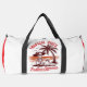 This white duffle bag features a humorous graphic of a skeleton relaxing under a palm tree on a beach at sunset, wearing a hat, with the text "TROPICAL VIBES" above and "Endless Summer" below. This quirky design is perfect for those who love summer, the beach, and a bit of dark humor. Edit color of the bag caps and body in the Design tool to your favored colors.