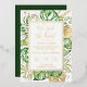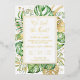 Dieses elegante tropische Empfang lädt mit grünen und goldenen Palmen, Philodendron und Farn-Blätter zum Verweilen ein. Ein eleganter Rahmen aus Goldfolie hebt den Goldfolientext hervor. Gold-Spritzer unterstreichen dieses exotische botanische Design und bringen ein bisschen moderne Laune in die Einladung. "Wir haben den Knoten getippt! " zusammen mit den Namen der Braut und des Bräutigams sind oben aufgeführt. Details zum Hochzeitssegment und den Ort und das Datum des Empfangs sind unten beschrieben. UAWG Informationen finden sich auf der Rückseite der Einladung.