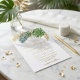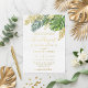 Diese elegante Hochzeitseinladung besticht durch ein Aquarelldesign üppiger tropischer Blätter in Grüntönen. Die Blätter sind mit einer Goldfolie versehen, die eine Touch Luxus verleiht. Der Text ist in einem stilvollen Schriftart mit Goldfolie-Kalligraphie gedruckt, der leicht vor weißem Hintergrund zu lesen ist. Diese Einladung ist ideal für eine Hochzeit oder eine Hochzeit in Urlaubsort in einem tropischen Ort.