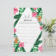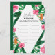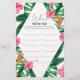 Tropical Palms Watercolor Bridal Dusche Einladung. Das Design besticht durch ein elegantes Bouquet mit klassischen Strandfarben und Blume, darunter rosafarbener Hibiskus, orangefarbene und blaue Paradiesvögel, grüne Vegetation und dunkelgrünes Palmenblatt.