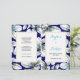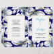 Tropische Blüten gefaltet Hochzeitsprogramm. Dieses moderne Blumendesign besticht durch hübsche, weiße Blume mit Blattgold und Aqua-Details in Marineblau. Es ist perfekt für eine Hochzeit im Sommer. Falten Sie es in die Mitte, um ein zweifaches Hochzeitsprogramm zu machen. Wählen Sie nur den Papierwerttyp aus.