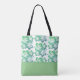 Diese Tasche wird mit einer niedlichen tropischen Blume gedruckt in einem in den grünen Farbtönen auf weißem Hintergrund mit einem weichen grünen Akzent am unteren Rand. Mittlere Größe angezeigt. Hat schwarze Gurte. Passen Sie dieses Objekt an oder kaufen Sie, wie es ist.
