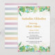 Eine stilvolle Einladung für einen Abschluss mit tropischem Thema, mit einem oberen und unteren Rand von hübschen Blume und Grün mit einer Touch von goldfarbenen Konfetti (digital gerendert). Der Rücken weist ein breites Streifen in der Farbkoordinierung auf.