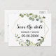 Diese Karte mit grünen tropischen Blätter Save the Date ist perfekt für eine Hochzeit in Urlaubsort. Das Design besticht durch handbemalte grüne Blätter, die einen goldenen geometrischen Rahmen schmücken.