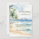 Ein Strand mit feinem Sand, Meereswellen und Palmen als Hintergrund. Personalisieren und fügen Sie ein Datum und Ihre Namen. Der Text: Save the Date ist mit einem großen angesagten, handgeschriebenen Stilskript geschrieben.