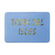 Mosaik, grafischer Text, "Tropische Inseln", ein fiktiver, fantasievoller Ort, der in einem exotischen Inselmuster dargestellt wird; orange, olivgrün, gelb, taupe, braun, schwarz und weiß.