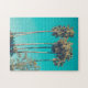 Ein Rätsel mit einem schönen Foto. Große Palmen mit langen schmalen Stämmen vor einem schönen grünen Himmel. Retro-Farbschema. Entspannen und kühlen.