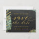 Eine elegante Aquarellmalerei mit tropischer Hochzeitseinladung mit einem dramatischen, schwarzen Aquarellwaschbecken mit exquisit bemalten grünen Palmen-Blätter und schimmernden Goldakzenten. Eine lebendige Goldswash-Skript-Kalligraphie kündigt Ihre Hochzeitsdetails an.