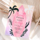 Ein tropischer Strand zum Thema 16 . Geburtstag Geburtstag Einladung mit einem coolen rosa Surfbrett mit editierbaren tropischen Palmen, Palmen Blätter, auf einem rosa, lila gelben Wasserfarbenwaschbecken, fügen Sie Ihr Foto auf der Rückseite. Perfekt für den Sommer süß 16 Party.