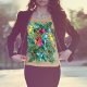 Tropische Vögel unter den Blätter der grünen Pflanze, Vliesstoffe und Blume mit Sonnenuntergang, um die Ankündigungskarte zu personalisieren