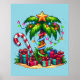 Poster mit einem saisonalen Urlaubsbild. Eine tropische Palme, die mit festlichen Lichtern dekoriert ist und auf der ein Stern steht. Ein riesiger, rot-weißer Bonbons, der aus dem Sand ragt. Weihnachten präsentiert sich unter dem Baum. Whimsical und lustig.