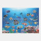 Tropischer Fisch schwimmen Meeresgrund, es ist Zeit, unter dem Meer zu Party. Die Unterwasserszene ist belebt und chaotisch, mit tropischen, schwarz-weiß gestreiften Fischen gemischt mit Goldfischen. Genießen Sie die Erinnerungen des Schnorchelns mit einem lebhaften Unterwasserfoto von seichten Gewässern mit tropisch blauen Schalen, Schnecken und Oktopus-Set vor dem Hintergrund der grünen Korallen.
