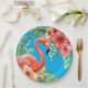 Tropische, zarte Aquarellbramingos in rosa und orangefarbenen Hibiskus-Blume mit tropischem Blattwerk. Die Hintergrundfarbe kann geändert werden.