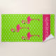 Dieses niedliche Badetuch mit hellrosa Flamingos auf einem Hintergrund tropischer, grüner und weißer Polka-Punkte. Personalisieren Sie den passenden rosa und weißen Streifen mit Ihrem Namen oder speziellen Text.