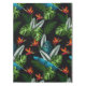 Ein schicker schwarzer Hintergrund. Der tropische Regenwald ist grün und blau, der Dschungel. Blätter aus Palmen und Bananen, Rot- und Orangenblumen, Blume