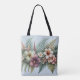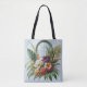 Stellen Sie sich eine Tüte vor, die perfekt für die Erkundungsrennungen geeignet ist und mit tropischem Blattwerk im hawaiianischen Stil dekoriert ist, das durch ein gewölbtes Fenster mit Blume von Hibisken und Farnen geschmückt ist. Die sanften Farbtöne der Erde werden durch eine Reihe von Farnen und Blättern ergänzt. Die Rückseite bietet einen anderen Blick auf eine ähnliche Blumenlandschaft.