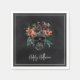 Ein wunderschönes Halloween-Design mit einer tropischen, blumengeschmückten Skulptur mit orangefarbenen und bordeauxfarbenen Blume und grünem Dschungelblätterdach auf einem rauchigen schwarzen Hintergrund. Personalisieren Sie diese einzigartige und elegante Halloween Papierserviette mit eigenem Text; gezeigt mit "Happy Halloween".