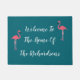 Herzlich willkommen auf Ihrer Zuhause mit diesen farbenfrohen monogramm Zuhause-Begrüßungstüren, die mit zwei tropischen rosa Flamingos und stilvollem Textdesign mit Familiennamen-Vorlage entworfen wurden, können Sie durch Ihren eigenen Familiennamen ersetzen.