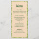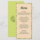 Ein Blumenmenü mit einer tropischen Pflanze, in der Mitte errötet (oder apricot) und im Hintergrund ein Zitronengrün mit einem Motiv aus tropischen Blättern. Alle Details können an Ihre eigenen Hochzeitsnahrungsmittel angepasst werden.
