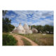 Foto aus dem weißen Stein, konische traditionelle Trulli-Häuser mit einer Einfahrt und ein Garten mit Olivenbäumen unter einem schönen Himmel auf einem Ferienort in der Nähe von Alberolbello in Apulien/Apulien in Süditalien.