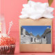 Collier photo rectangulaire avec maisons traditionnelles en plâtre blanc trulli avec tuiles en pierre dans les toits coniques dans une petite rue de la ville Alberobello, Vallée d'Itria dans les Pouilles, Italie.