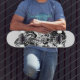 Skateboard-Version des Kunstwerks ''Meal-Czech'' Bildfiguren und abstrakte Objekte in Schwarz und Weiß. Keine Bedeutung ist es zu suchen, sondern kann in jeder Ecke gefunden werden.
