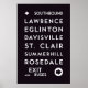Affiche de style "rollsign" de la Toronto Transit Commission. Les lignes de métro de Yonge s'arrêtent sur cette ligne. Liste des stations sur l'affiche : signalisation "Southbound", Lawrence, Eglinton, Davisville, St. Clair, Summerhill, Rosedale, signalisation "Exit and Buses".