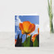 Bug's-eye vue d'une tulipe de printemps orange vif contre un ciel bleu.