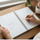 Un planificateur de mariage avec une belle couverture représentant deux tulipes délicates dans des tons bleu de Delft, symbolisant l'amour et les nouveaux départs. Les noms des mariés, écrits élégamment en calligraphie fluide, occupent le devant de la scène, créant une touche personnelle et romantique