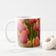 Ein tiefrosa Tulpe aus dem Single hebt sich von einem Feld aus rosa und gelben Tulpen hervor. Foto in der Nähe von Amsterdam, Niederlande.