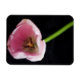 Ein Stillleben-Foto einer frisch geschnittenen rosa Tulpe, mit langen grünen Stielen, die auf schwarzen Stoff abgelegt ist. Copyright ©Kimberly J Tilley.