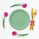 Tulpen und Schmetterlinge grüne Muster Papier Teller. Die Tulpen in Rosa, Gelb und Orange sind auf grünem Hintergrund gestaltet. Rosa und gelbe Schmetterlinge verfärben sich um die Tulpen herum und verstärken die fröhliche Ästhetik mit einer skurrilen Touch!