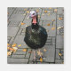 Der Truthahn geht auf dem Bürgersteig spazieren, mit Herbstblättern um ihn herum.