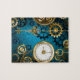 Türkis, strukturiert, Steampunkhintergrund mit Messing- und Goldgetrieben, Silberschlüssel und Uhr. Steampunkstil.