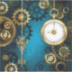Türkis, strukturiert, Steampunkhintergrund mit Messing- und Goldgetrieben, Silberschlüssel und Uhr. Steampunkstil.