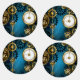 Türkis, strukturiert, Steampunkhintergrund mit Messing- und Goldgetrieben, Silberschlüssel und Uhr. Steampunkstil.