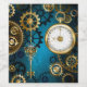 Türkis, strukturiert, Steampunkhintergrund mit Messing- und Goldgetrieben, Silberschlüssel und Uhr. Steampunkstil.