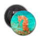 Schönes, lichtdurchflutetes orangefarbenes Seepferd mit türkisfarbenem Meerwasser. Die Farben Blau, Türkis und Orange.