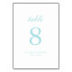Eine türkisfarbene und weiße Tischnummer mit Braut- und Bauernnamen und Hochzeitstag.