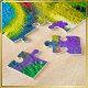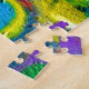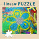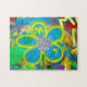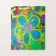 Relaxtes Puzzling - Dieses einzigartige Graffiti-Foto zeigt eine türkisfarbene Blume mit gelber Kontur auf einer Graffiti-Mauer. Es ist ein helles Stück Straßenkunst.